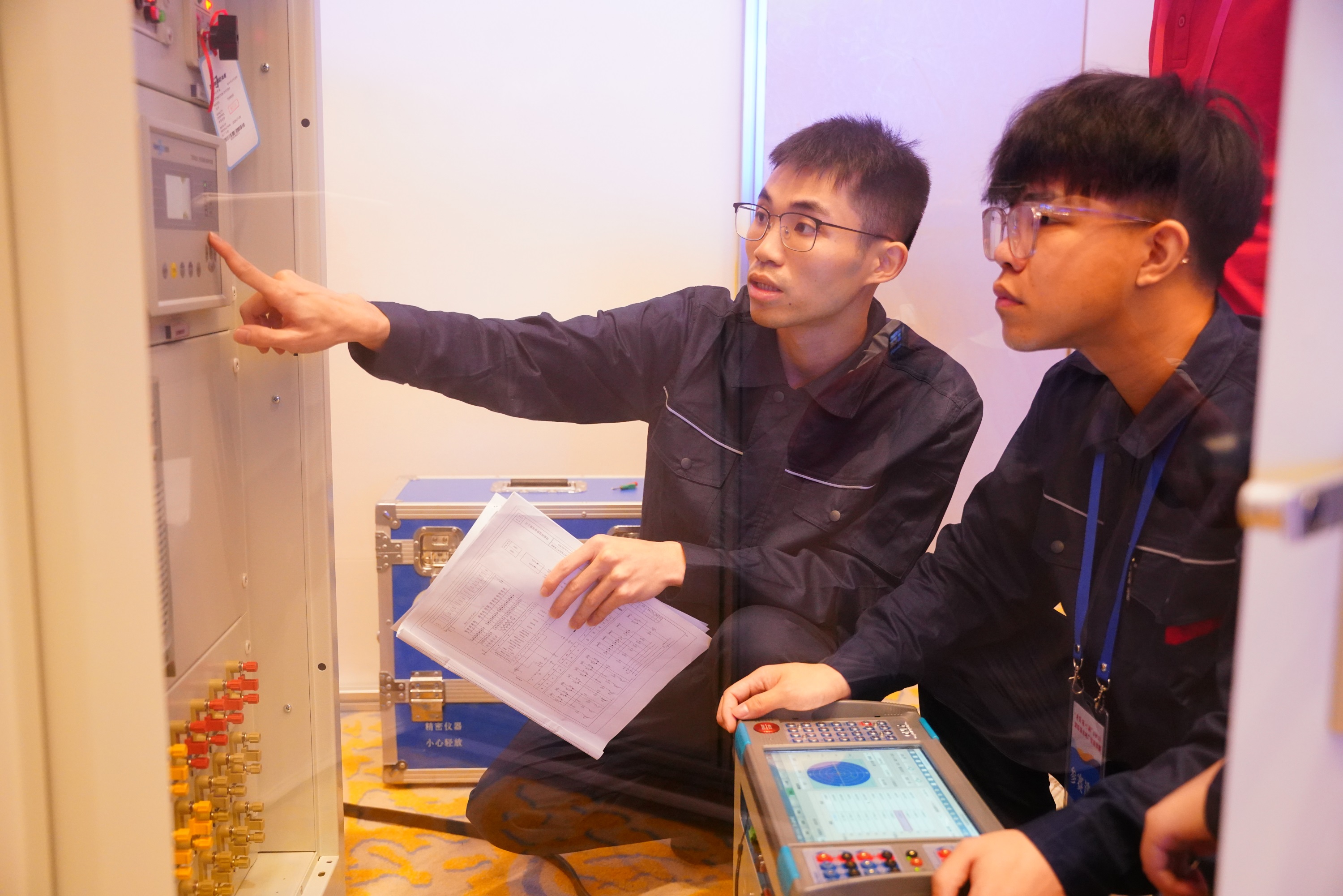技能競(jìng)賽分為技能操作考試和理論知識(shí)考試兩大部分。9月10日至11日,進(jìn)行技能操作考試比賽,包括個(gè)人項(xiàng)目J1二次回路接線與調(diào)試和團(tuán)隊(duì)項(xiàng)目J2繼電保護(hù)故障排查與系統(tǒng)測(cè)試、J3現(xiàn)代電廠自動(dòng)控制系統(tǒng)綜合能力運(yùn)用。